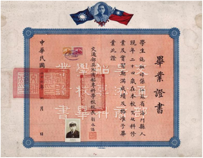 施祖炜(1912-2015),吴淞商船学校1933级驾驶科学生。曾任民生公司“民元”轮二副。1937年8月12日,“民元”轮通过江阴常山水道后,航道随即遭封锁。为保障这条维系大后方经济军事命脉的长江中上游“黄金水道”安全,施祖炜冒着日军轰炸扫射,参与民生公司组织的上海至南京人员物资大转移、宜昌大撤退等行动,抢运兵员与物资。